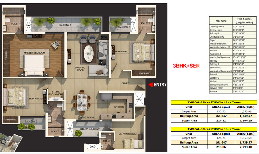 | 3BHK+SER.ROOM- UNIT PLAN (TYPICAL LAYOUT PLAN) | 2299 SQ.FT. | PRICE ON REQUEST |