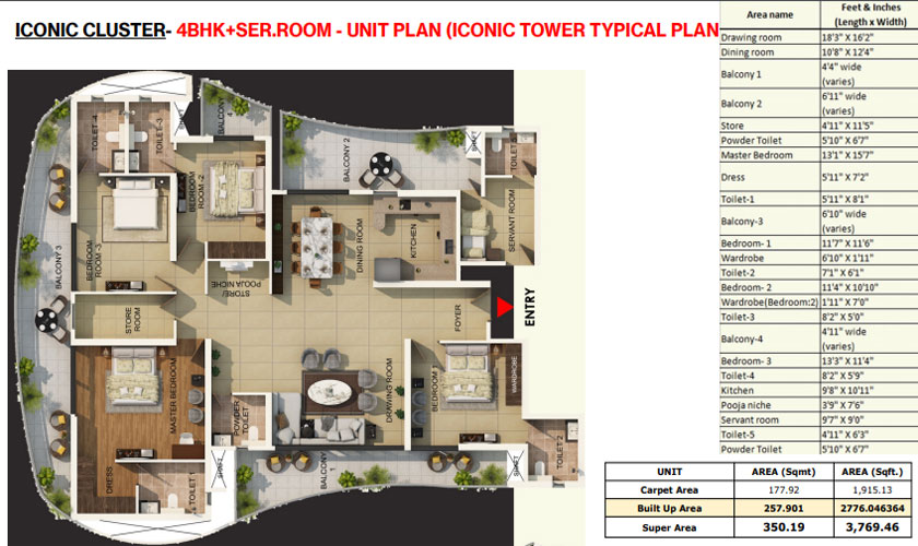 | 4BHK+SER.ROOM - UNIT PLAN (ICONIC TOWER TYPICAL PLAN) | 3769 SQ.FT. | PRICE ON REQUEST |